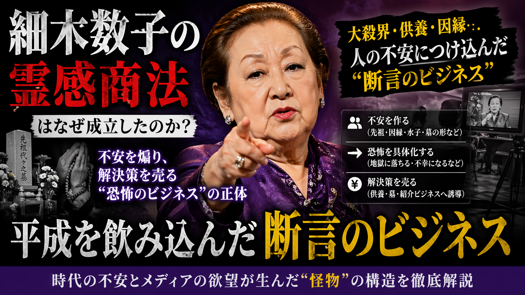 細木数子は、ただの“強気な占い師”として消費していい存在ではない。そう片づけると、本質を見失う。問題の芯にあるのは、占いの当たり外れではなく、人の不安を具体的な恐怖に変え、そのうえで「解決策」まで自分で売る構造にある。