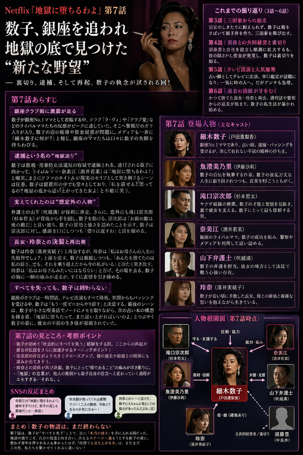 Netflixシリーズ『地獄に堕ちるわよ』第7話は、細木数子の物語が「地獄から這い上がる女の成功譚」から、「人を救う力が、人を縛る力へ変わっていく物語」へ反転する回だ。