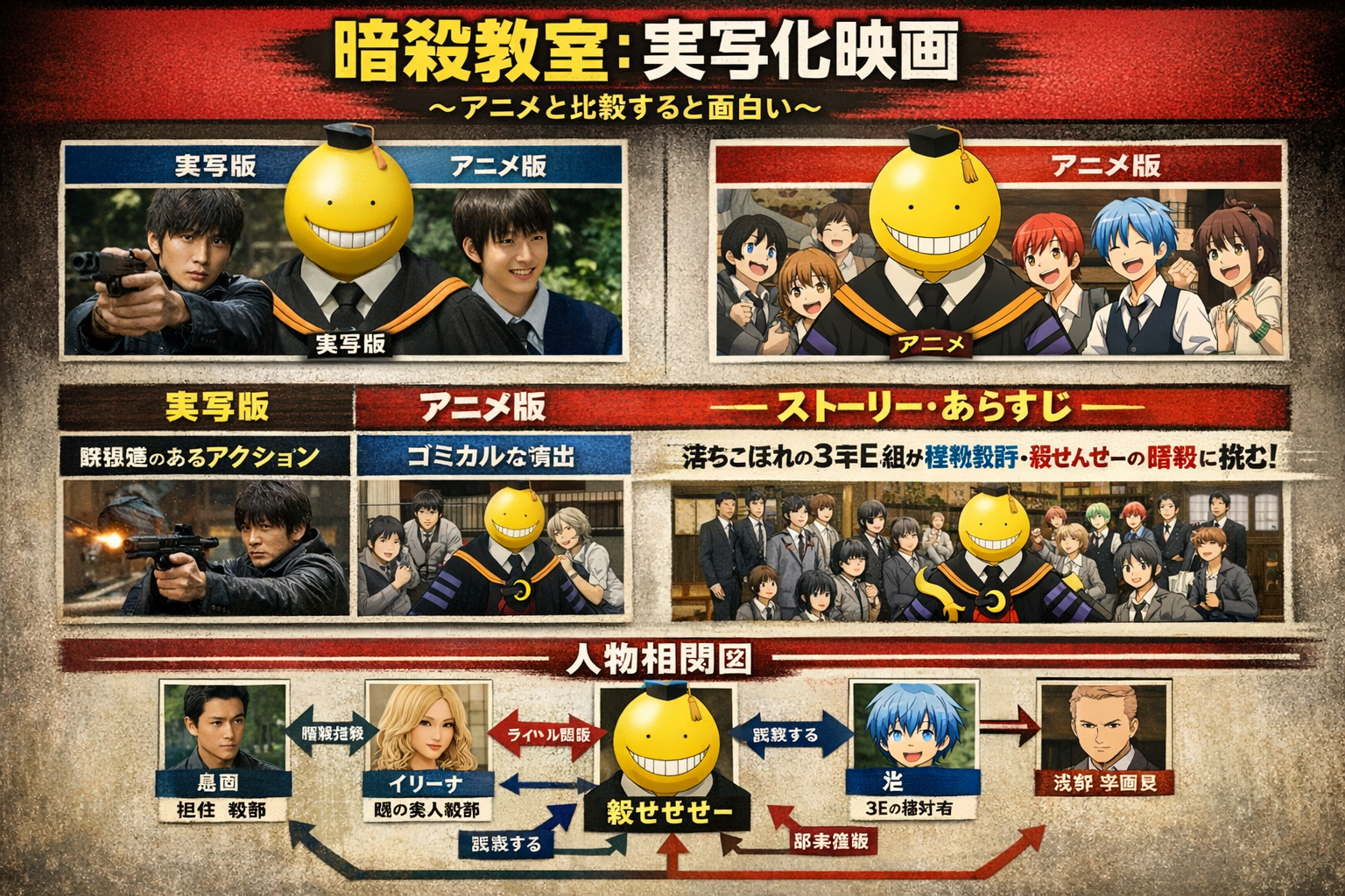 進学校の授業についていけない生徒たちをE組にまとめ、校舎も別にしていて、差別されたE組の生徒たちは「やる気・意欲」をなくしています。政府から「殺せんせー」の暗殺を依頼された生徒たちは、「成功報酬100億」に「やる気」を出し、「殺せんせー」の暗殺を目指しますが、なにせマッハ20のスピードで動くので、余裕で攻撃をかわしながら、普通に勉強を教えています。