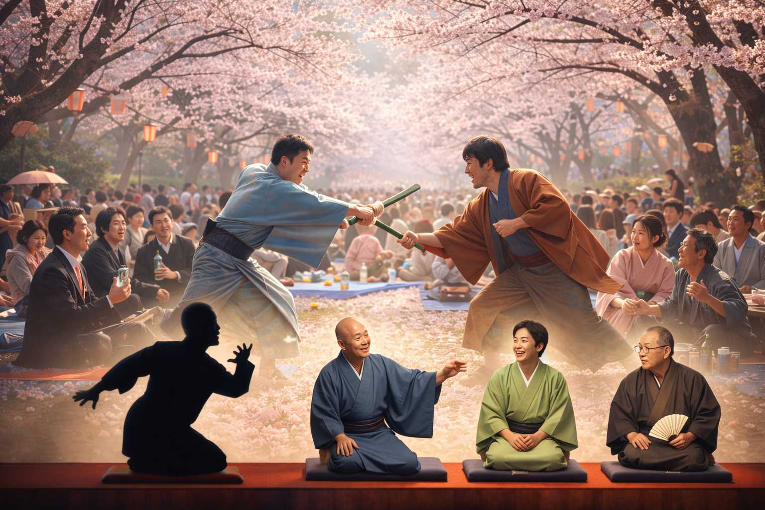 「花見の仇討」は、花見の場で見物人を驚かせようと、仇討ちの芝居を仕掛けた仲間たちが、段取りの狂いによって収拾のつかない展開に落ちていく噺です。