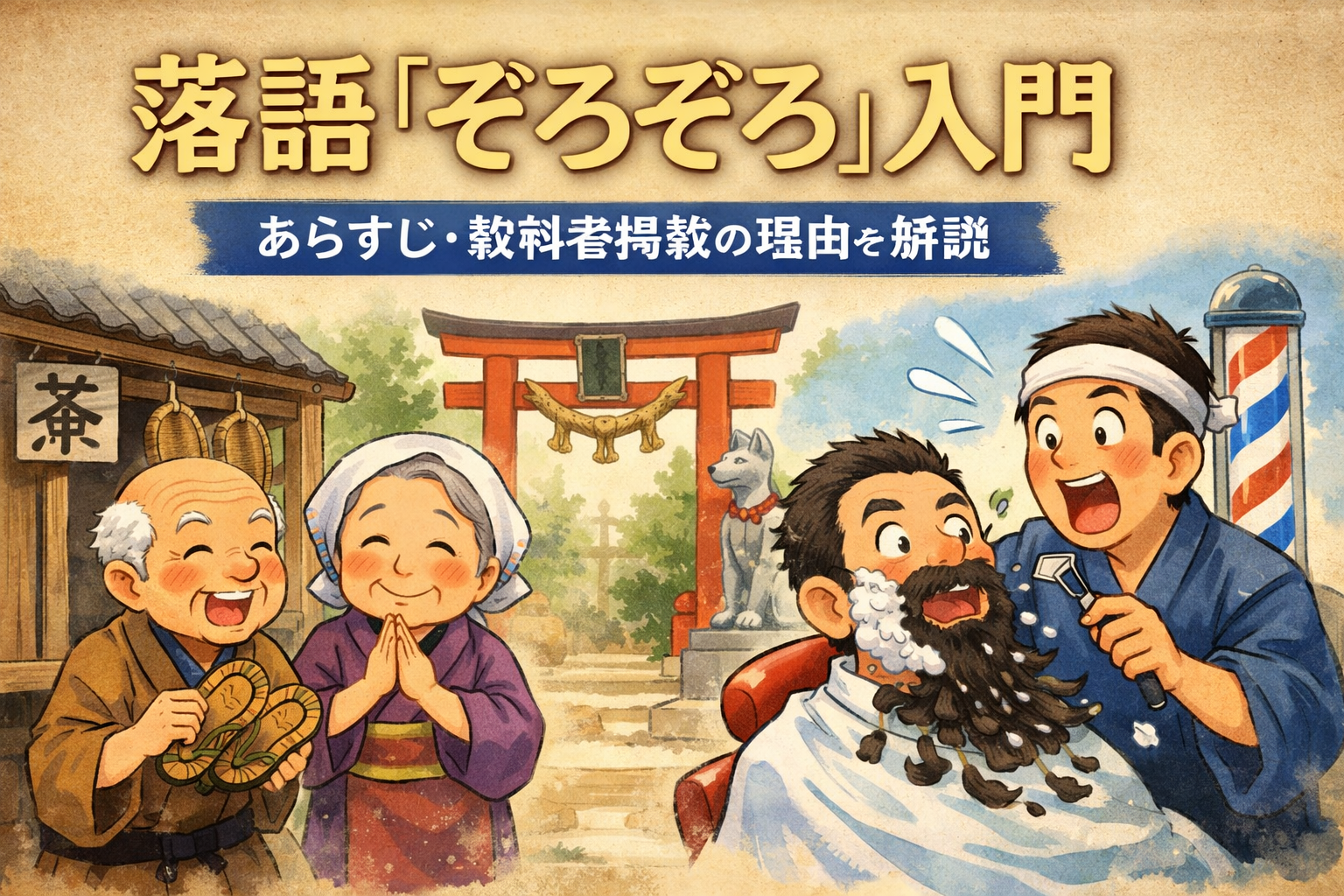 まずはこの入門記事で全体像をつかみ、そのあとで WriterzLab の「★教科書に掲載された落語『ぞろぞろ』」へ進めば、この噺のおもしろさがもう一段はっきり見えてきます。