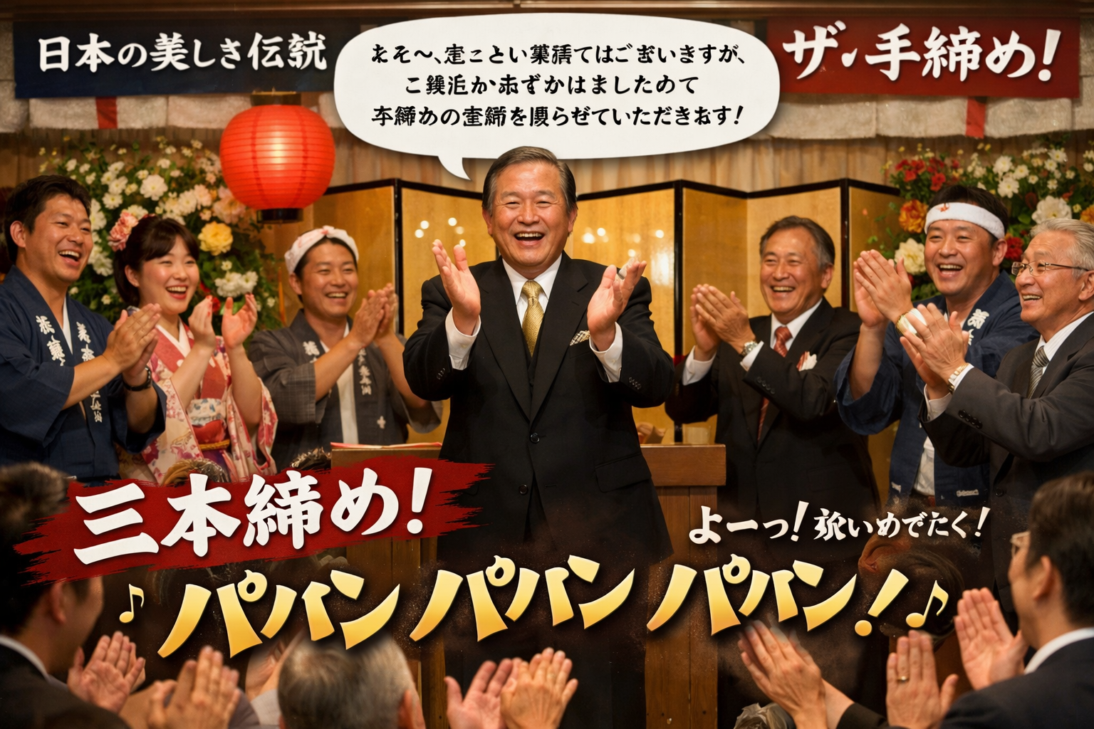 『手締め』とは、本来イベントを主催した(取り仕切った)した胴元(元締め)が、協力者(スタッフ)に対して、つつがなく滞り無く無事に終了したことを、感謝することである。